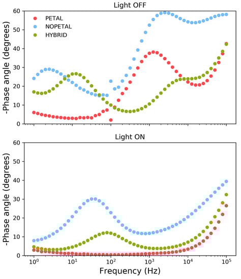When the electrodes are illuminated at 1 V, Nyquist plots indicate a similar overall decrease in impedance across the entire frequency range for all samples. For samples NOPETAL and HYBRID , a significant impedance response is also present at lower frequencies; a closer inspection of the behavior of the phase angle reveals significant differences in the behavior of the three surface structures in this region (Figure 5). While the PETAL layer shows near-ideal resistive behavior across the frequency spectrum up to 100 Hz, a residual RC contribution at low frequency remains for the NOPETAL and HYBRID layers. We also note that, upon illumination, the phase behavior, as a function of the frequency, is intermediate between the ones of the HYBRID and PETAL layers, corresponding to the fact that the surface morphology is also in between the two (see Figure 1a–c).The overall picture suggests that the formation of surface states (i.e., CoOOH or CoO2) is linked to the presence of the petal-like structures. The time constant visible in Figure 5 with light on, at around 50 Hz, can then be linked to the charge transfer resistance between the electrode and the species in the solution. For sample NOPETAL , there is significant resistance probably given by the fact that the reaction mechanism largely does not directly involve the formation of surface states on the cobalt oxide surfaces. At the opposite extreme, sample PETAL does not have significant contributions in this region due to the direct involvement of Co3O4 surface states in the reaction, which form a low impedance pathway for electrons. Sample HYBRID lies in between; as can be seen in Figure 1, some petal-like structures can be spotted in sample HYBRID, but most of them were destroyed by the thermal treatment.