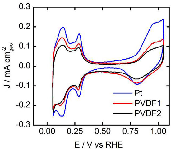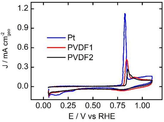 In Figure 1, the cyclic voltammograms (CVs) of the bare Pt surface and the two different PVDF films on polycrystalline Pt recorded in Ar saturated electrolyte solution are shown. The two different dip coatings were made from solutions containing 0.1 M and 0.1 mM of PVDF solution, respectively. The voltammetric profiles of polycrystalline Pt are generally divided into three electrode potential regions: (i) the hydrogen under potential deposition (Hupd) region (0.05–0.3 VRHE), (ii) the double layer region (0.3–0.7 VRHE), and (iii) the potential region of OHad and Oad formation and reduction (>0.7 VRHE) [16]. The effect of PVDF can be scrutinized by comparing the different CVs in the respective potential regions. Starting with the Hupd region, two characteristic peaks of polycrystalline Pt in contact with a H2SO4 electrolyte solution are present for all samples. However, the Hupd currents decrease according to the amount of deposited PVDF (concentration of PVDF in the dipping solution). The formation and reduction oxygenated species exhibit the same trend, i.e., the intensity of the peaks decreases as more PVDF is deposited. In contrast, the double layer potential region remains similar for all the samples. Only a small increase in the pseudo-capacity is discernible for the Pt surfaces covered by PVDF, which might be interpreted by a minor surface roughening or by a small increase in the concentration of water dipoles close to the electrode surface. However, at the same time, the presence of PVDF clearly reduces the amount of Hupd and OHad species adsorbed onto the Pt surface. Further, the analysis of the Hupd peaks is a common method to determine the ECSA used for normalizing the measured activity of a Pt electrode. Integration of the Hupd peaks and the resulting charge, , can be related to the charge of a freshly flame annealed polycrystalline Pt surface, which has a per area unit 210 [17]. From this analysis, we can determine the loss in ECSA due to the PVDF coverage to 27 % and 43 % for PVDF 1 and PVDF 2, respectively.