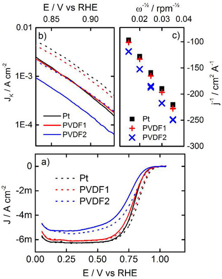 In Figure 3a, the ORR polarization curves of the three samples are separated into positive- and negative-going curves and compared with each other. Based on the current profiles, two distinct potential regions can be observed: the kinetic potential region at an electrode potential E > 0.8 VRHE, and the hydro dynamic mass transport limited potential region at E < 0.6 VRHE. The latter is easily identified by its strong rotation rate dependency (not shown). The influence of the thick PVDF coating (PVDF 2) can clearly be seen in the mass transport limited potential region, as well as in the kinetic region by a significant decrease in current. Furthermore, all curves exhibit a hysteresis, i.e., a difference in currents between the positive- and negative-going potential scan is observed. This hysteresis is a typical feature in RDE measurements and can be interpreted due to the fact that the steady state coverage of oxygenated species is not instantaneously achieved on Pt during potential sweeps when coming from the reduced or oxidized surface (lower or higher potentials). Thus, the observed ORR rate is artificially enhanced [19,20] in the positive-going polarization curves, whereas it may be too low in the negative-going polarization curves. This is explicitly shown in Figure 3b in a logarithmic Tafel plot of the kinetic current densities normalized to the geometric electrode area, i.e., JK. Note that the curves have been corrected for diffusion effects by the use of the Koutecký-Levich equation. In the positive-going potential sweeps, significantly higher kinetic ORR rates are determined than in the negative going potential sweeps. However, in the Tafel plot, the curves of the different kinetic currents form almost parallel lines, indicating that the same ORR reaction pathway is valid for all investigated surfaces. Furthermore, while larger amounts of PVDF inhibit the observed kinetic ORR current, the kinetic ORR currents on the bare Pt surface and PVDF 1 almost overlap. This means that although the ECSA on PVDF 1 is reduced, and the kinetic current is not affected.