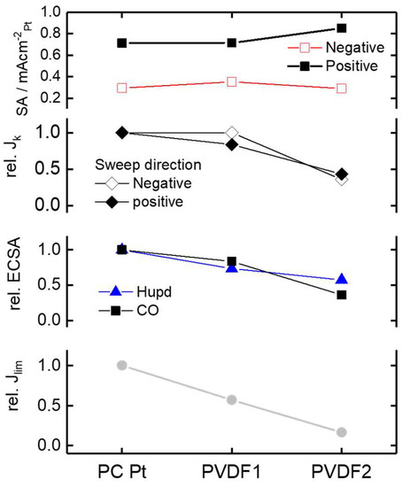 In Figure 4, comparing the JK with the normalized SA (normalized with the CO stripping charge) for Pt, PVDF 1, and PVDF 2, a complex behavior becomes apparent. In the positive-going potential scan (which is in general analyzed in RDE measurements), JK decreases with the PVDF content. However, this decrease is “overcompensated” by the loss in ECSA. This leads to a somewhat higher SA, especially for PVDF 2. However, in the negative-going potential scan—which resembles most steady state conditions—an increase in SA is observed for PVDF 1, but almost no increase in SA is observed for PVDF 2. Taking all results into account, these findings indicate that the ORR kinetics are neither significantly inhibited nor enhanced by the PVDF films. Improvement in SA seems mostly related to the fact that the surface area determination is “more affected” by the PVDF than the ORR itself, which might be related to the fact that for the ECSA determination, different probe molecules are used.