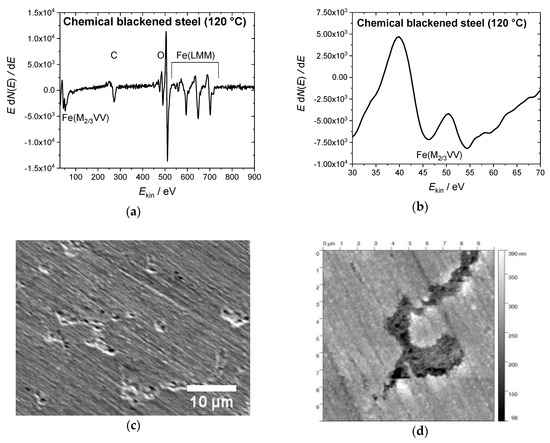 The steel samples were prepared according to the recipe that is described in DIN 50938 in order to compare the electrochemical and the chemical hot alkaline blackening procedures [22]. The polished steel slices were immersed into a boiling solution of blackening salt dissolved in water (concentration 1 kg·L−1) at 130 °C for 12 min, yielding a uniform black-blackened surface. Auger electron spectroscopy identified the iron oxide species (see Figure 1a). The resulting oxide species were determined by the intensity ratio of the fine structure of the Fe(M2/3VV) signals at 46 and 54 eV [23]. The relevant intensity ratio of approx. 8 to 10 matches that of Fe3O4 (Figure 1b). The magnetite surface appears relatively smooth (profile roughness parameter Ra = 12 ± 1 nm) (see the SEM and AFM images in Figure 1b,c). Besides some cracks, surface defects that have been formed during the blackening process are visible in these images.