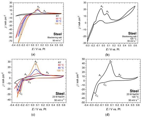 According to the Pourbaix diagram of iron [17,24] and the well-known electrochemical behavior of iron in alkaline solution [11,25,26,27,28,29,30], the anodic peak A1 at −0.08 V vs. Pt for steel in 23 M NaOH (Figure 2c,d) was identified as the oxidation of Fe to Fe(II) [28,29,30]. This is in agreement with the reaction that is given in Equation (1). The peak A2 at around 0.1 V vs. Pt in blackening salt solution and in the range of 0.06 to 0.16 V vs. Pt in sodium hydroxide corresponds to the oxidation of iron hydroxide to magnetite that is in correspondence to the Schikorr reaction (Equation (3)) [11,27,28,29]. Magnetite is finally oxidized to iron(III) oxide at peak A3 [11,27]. Furthermore, the two cathodic peaks of C2 and C3 are observed for nitrite-free solutions (Figure 2c,d). They correspond to the related oxidation peaks A2 and A3 [29]. Measurements that were obtained with blackening salt solution (Figure 2a,b) only exhibit the anodic peaks A2, A3, and the hydrogen evolution regime. It is noteworthy that the current and charge densities for sodium hydroxide solution are approximately twice as large as those that were measured with blackening salt.