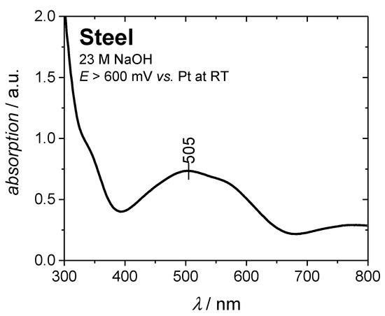 Electrochemical blackening at temperatures below 80 °C by using more positive potentials was not successful. Apparently, ferrate(VI) ions (FeO42−) are formed at higher potentials, resulting in a purple colored electrolyte [28,31,32]. UV-VIS spectroscopy (Figure 4) could confirm the electrochemical formation of the ferrate(VI) ion, showing a band with an absorption maximum at 505 nm (green color, complementary of purple) [32,33,34].