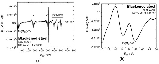 The open circuit potential (EOC) that was established for steel in blackening salt solution after 12 min is −0.05 V vs. Pt, which is located around the onset of peak A2 (Figure 2b). For this reason, the potential was set to 0 V vs. Pt for the electrochemical treatment with blackening solution at 100 °C. Applying a potential of 0.1 V vs. Pt in 23 M NaOH solution at 100–120 °C (Figure 2c), which almost corresponds to peak A2, yields a uniform black magnetite layer after 12 min. With the same potential at 80 °C in blackening salt and 23 M NaOH solution, insufficient blackening is obtained due to the slow kinetics of the Schikorr reaction. It is obvious that the electrode potential and temperature are the main parameters that control the quality of electrochemical blackening. Within the same process time of 12 min, a more positive electrode potential of 0.5 V vs. Pt with blackening salt and 0.6 V vs. Pt with sodium hydroxide solution leads to the formation of a compact Fe3O4 overlayer, which Auger electron spectroscopy subsequently characterized (Figure 5).