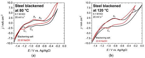 Cyclic voltammogram of blackened steel discs in 0.1 M KCl solution at (a) 80 °C and (b) 120 °C; black curve: blackening salt; red curve: NaOH; scan rate 20 mV s−1.