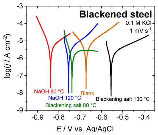 Potentiodynamic polarization curves for pristine and blackened steel surfaces in in 0.1 M KCl; scan rate 1 mV s−1. Electrochemical blackening was performed both in 23 M NaOH and blackening salt solution.