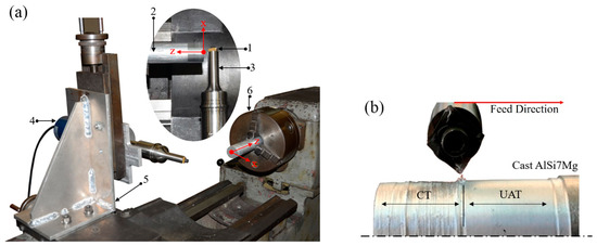 The turning experiments (Figure 1a) were performed in dry condition while using a conventional lathe (EFI DU25, EFI, Trofa, Portugal). The Al alloy workpieces are given an anticlockwise rotation, while the tool vibration with UAT is aligned with the cutting direction (Figure 1b). The lower side of the insert is used as the active cutting edge, which safely projects the resulting chip away from the user. Figure 1a shows the experimental setup and it identifies each component as the following: (1) Insert, (2) Workpiece, (3) Acoustic radiator (horn), (4) Transducer, (5) Support of UAT system, and (6) Spindle. MPInterconsulting manufactures the ultrasonic components (Le Locle, Switzerland).