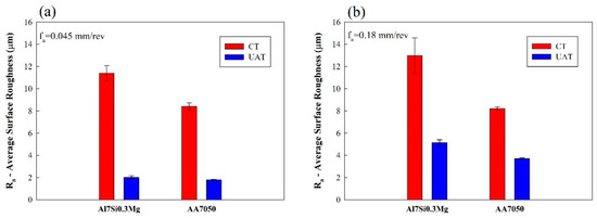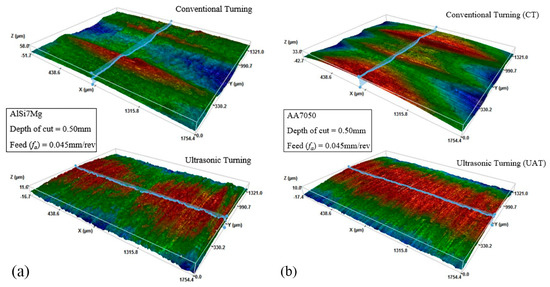 It may be observed that, while the rough cutting is evidently shown in the traditional process, there are almost no periodic peaks that can be traced upon using the ultrasonic vibration. These observations on surface plots are in accordance with other authors [33]. The AA7050 samples in Figure 4b show a consistent tool path, particularly for the UAT, which resulted in the most homogenous texture of all the samples. In contrast, the conventional turning Al7Si0.3Mg samples displays damaged topography. The tool trajectory can be easily detected on the workpiece surface through the ridges that formed from its plastic deformation [34]. Although, such a detrimental effect is not seen when UAT is applied. This observation is in accordance with the different standard the deviation values for UAT that are presented in Figure 2a and Figure 3a, suggesting a close relationship between the material deformation properties and the UAT performance.
