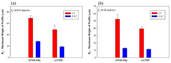 Maximum height of profile (Rz) for the tested materials using feed rate of (a) 0.045 and (b) 0.18 mm/rev.
