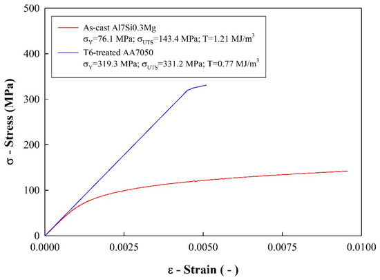 Average stress-strain curved of the tested materials (Al7Si0.3Mg and AA7050).