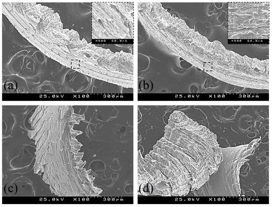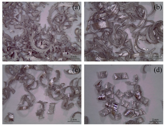 The morphology of the resulting chip formed during machining process was observed under a stereo microscope that was coupled to an image acquisition system (EZ4 HD, Leica, Wetzlar, Germany). A detailed characterization of their surfaces was performed using a scanning electron microscope (SEM—S 4100 Hitachi, Tokyo, Japan).