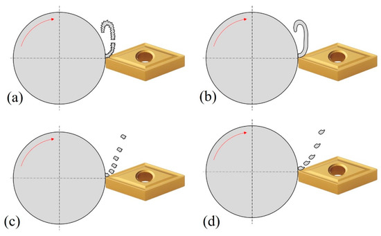 Suggested chip formation during the turning operation: Al7Si0.3Mg sample by (a) UAT and (b) CT; and, AA7050 sample by (c) UAT and (d) CT.