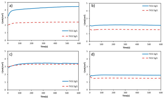 Figure 1. Current density variations during electrophoretic deposition (EPD) process from alcoholic suspensions (a,c) methanol and (b,d) ethanol, containing 0.5 g/L chitosan 2 (a,b) and 5 (c,d) g/L hydroxyapatite (HA) with various concentration of titania at 20 V/cm.