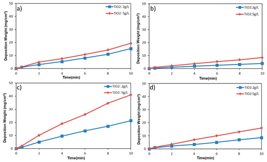 Figure 2. Weight of HA–chitosan–titania coatings deposited at 20 V/cm, from alcoholic suspensions (a,c) methanol and (b,d) ethanol, containing 0.5 g/L chitosan, 2 (a,b) and 5 (c,d) HA and 2 and 5 g/L titania.