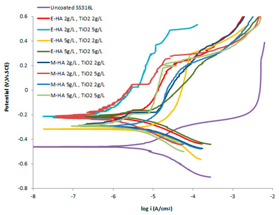 Figure 6. Corrosion behavior of uncoated 316 L stainless steel and coatings deposited at 20 V/cm and 30 s from methanolic and ethanolic suspensions containing 0.5 g/L chitosan, 2 and 5 g/L HA nanoparticles, and 2 and 5 g/L titania in SBF and at 37 °C.