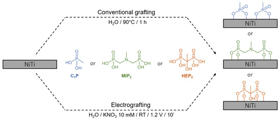 The chemical grafting (CG) on HT NiTi was achieved by its immersion (1 h at 90 °C) in 20 mL of 1 mM of the organophosphonic derivative (C1P, MIP2, or HEP2) aqueous solution [40]. The substrates are then ultrasonically cleaned in denatured ethanol for 15 min before being blow dried under nitrogen.