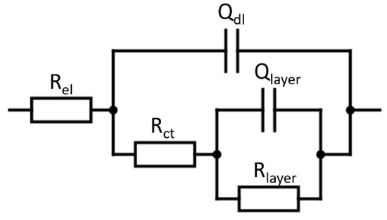 EIS measurements are carried out in the frequency range of 10 kHz to 0.1 Hz at an amplitude of 10 mV peak to peak. The obtained EIS data were presented in Nyquist representation and were fitted to the electrical equivalent circuit shown in Figure 2, where Rel, Rct and Rlayer are the resistances of the electrolyte, of charge transfer, and of the surface layer (oxide layer or oxide/SAM layer), respectively, and where Qdl and Qlayer are the constant phase element (CPE) of the electrochemical double layer and of the surface layer.