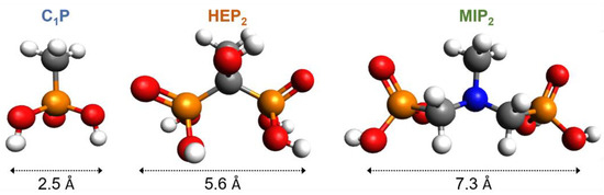 Simulated structured and estimated width of 1-methylphosphonic acid (C1P), 1-hydroxyethylidene-1,1-diphosphonic acid (HEP2), and (methylimino)dimethylene-bisphophonic acid (MIP2).