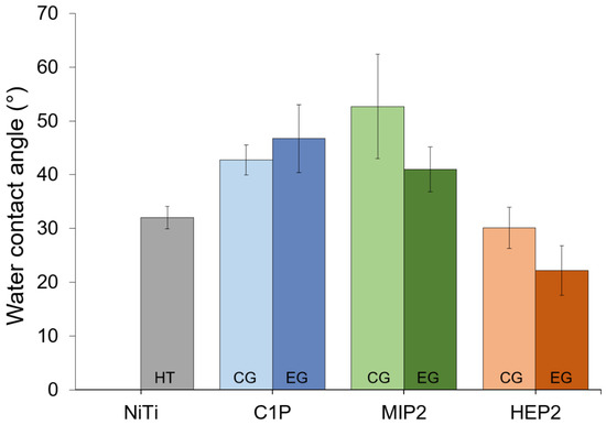 Figure 4 provides the water contact angle values. It is observed that, comparatively to HT and irrespective of the modification process (CG and EG), these values are slightly higher in the case of C1P and MIP2 and similar (or slightly smaller) for HEP2. This is consistent with the presence of the OH and of the CH3 head group carried out by HEP2 and by C1P and MIP2, respectively (Figure 1). Moreover, the similar contact angle between the oxidized surface (EG0 – 22.2° ± 2.7°) and HEP2-covered NiTi (22.2° ± 4.6°) can be explained by the presence of -OH group on HEP2 and the potential hydroxylation of the oxide layer through EG0.