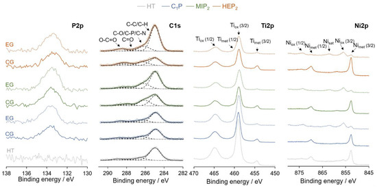 XPS analyses performed on HT, C1P, MIP2, and HEP2 confirm the successful modification of HT NiTi through the appearing signal of P2p and through the general shape of the obtained spectra for the C1s core level, as presented in Figure 5. These samples exhibit peaks at similar energies but with higher intensities in the case of modified NiTi with organophosphonic derivatives, indicating a successful organic modification of the surface alloy. The peaks at energies of 285, 286.5, 287.7, and 289.1 eV correspond respectively to carbon atoms involved in C-H/C-C, C-O/C-P/C-N, C=O, and O-C=O bonds present in the grafted molecules and contributions from atmospheric contaminations. The increase of the peak at 286.5 eV is particularly noticeable in the case of EG-MIP2 and EG-HEP2. XPS Ti2p and Ni2p core-levels for CG and EG, regardless of the type of grafted molecule, are consistent with the CG0 and EG0 results (Section 2.1), namely the metallic components of the Ti2p and Ni2p peaks are drastically reduced in the case of the EG treatment.