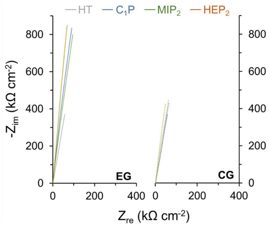 As attested to by the EIS measurements (Figure 7 and Table 2), this protection results from the increased surface layer resistance (Rlayer) from 2.900 MΩ cm−2 in the case of the HT-NiTi oxide layer to values of around 3 MΩ cm−2 and 10 MΩ cm−2 for C1P, MIP2, and HEP2 made by CG and EG, respectively.