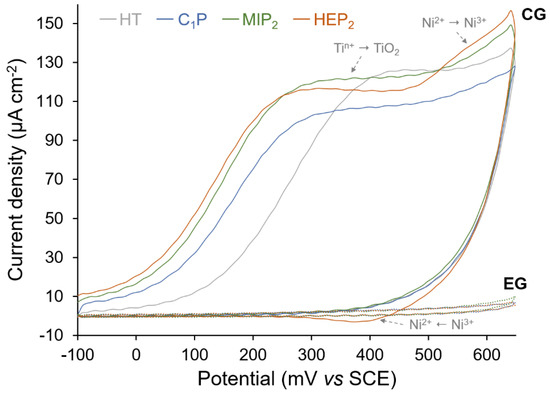 Representative first cycle of cyclic voltammograms for HT NiTi, C1P, MIP2, and HEP2 samples in 0.1 M NaOH at a scan rate of 20 mV s−1.
