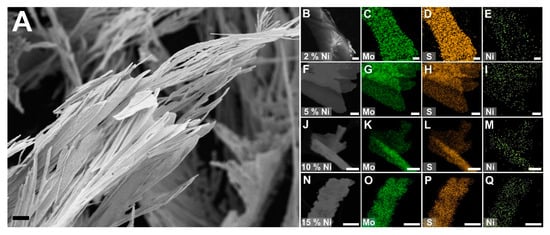 First, we optimized the synthesis of 3D-MoS2 scaffold to maximize the HER performance of the pure material (see Figure S1 and discussion in Supplementary Materials). Then, we studied the effect of Ni loading (2%, 5%, 10%, and 15% at. Vs. Mo) on the optimized scaffold, starting from the structural changes induced by the doping insertion. In Figure 1A, we report a SEM image of the resulting scaffold where the typical lamellar structure of MoS2 is evident. The same lamellar structure is maintained after all the different Ni-doping, as reported in Supplementary Materials (Figure S2). This suggests that the metal doping does not affect the morphology, although a slightly denser structure is observed when higher Ni loadings are used (Figure S2). In all cases, as shown via ADF-STEM and EDS chemical mapping (Figure 1B–Q), we observe a homogeneous distribution of Ni on the 3D-MoS2, no matter the percentage of the Ni-doping.