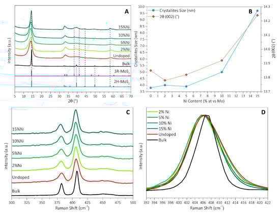 XRD and Raman data of the Ni-doped 3D-MoS2 as a function of Ni loading. (A) XRD patterns, bulk MoS2 data are reported as a reference; (B) crystallite diameter and 2θ (002) peak position; (C) Raman spectra; and (D) detail of A1g peak for the 3D-MoS2 samples. Reference XRD data are the calculated pattern for 2H-MoS2 (blue line) and 3R-MoS2 (purple line).