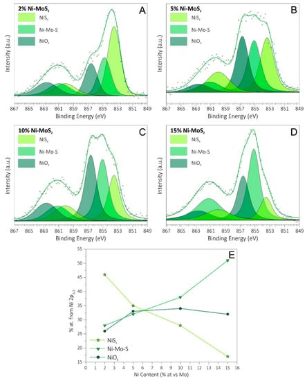 Multipeak analysis of Ni 2p3/2 photoemission region for Ni-doped 3D-MoS2 samples at different Ni loadings: (A) 2% Ni; (B) 5% Ni; (C) 10% Ni; (D) 15% Ni. (E) Evolution of Ni 2p3/2 components as a function of the Ni content.