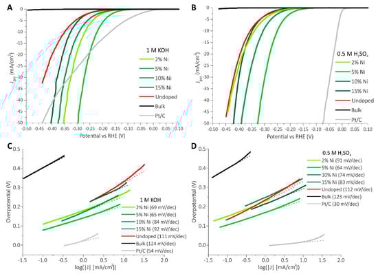Polarization curves and Tafel plots in 1.0M KOH (A,C) and in 0.5M H2SO4 (B,D), respectively, for the 3D-MoS2 and Ni-doped 3D-MoS2 materials.