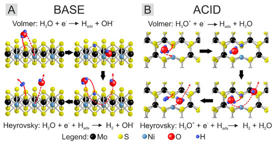 Schematic representation of the different catalytic sites for the HER in alkaline ((A), side view of MoS2 slab) and acidic ((B), top view) conditions.