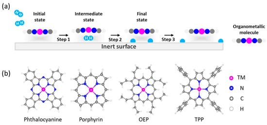 A quantum nutcracker consists of two inert components: an organic molecule such as transition metal phthalocyanine (TMPc), and an inert surface such as Au(111). In Figure 1a we show a schematic describing the various stages of a quantum nutcracker for hydrogen dissociation. The reaction process has three steps, as elaborated in our previous paper []: hydrogen molecules diffuse on the surface (initial state (IS)) and enter the interface between those two components (intermediate state (IMS)), followed by a break of the hydrogen bond at the interface (final state (FS)). Finally, the dissociated hydrogen atoms leave the interface. Among them, the entry of H2 in the molecule–surface interface, the first step, is the bottleneck of the overall reaction. In the second step, the dissociation barrier depends on the electronic structure of the transition metal atom in the organic molecule. In the third step, the energy barriers for the diffusion of atomic hydrogen on the surface are small and can be overcome at room temperature. In the case of transition metal phthalocyanines on Au(111), out of all the 3d transition metal atoms, Mn is the best candidate. Suitable alternative organic molecules are porphyrin and their derivatives, such OEP and TPP, as shown in Figure 1b.