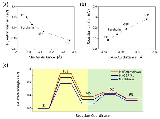 Relationship between catalytic activity and Mn–Au distance for the hydrogen dissociation reaction in an Mn-organic molecule/Au(111) system. (a) H2 entry barrier as a function of Mn–Au distance in initial states. (b) H2 dissociation barrier as a function of Mn–Au distance in Step 2. (c) Potential energy landscapes in different quantum nutcracker systems according to (a,b). Legend: IS, initial state; IMS, intermediate state; FS, final state; TS1, first transition state; TS2, second transition state.