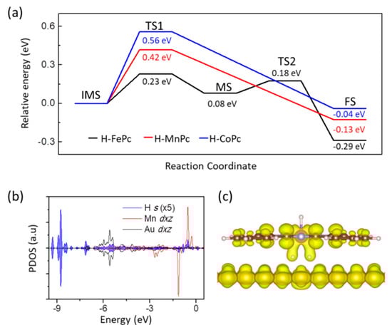 Single atoms and small molecules, such as H resulting from the H2 splitting process or contaminants such as CO or NO, may adsorb on top of TMPc molecules [,,]. Indeed, the ligand attached to the transition metal would also influence the interaction between the organic molecule and the surface [,,]. In Figure 3a we show the reaction process of different TMPcs with an adsorbed H atom on Au(111). In the H-MnPc/Au and H-CoPc systems, the reaction is a one-step process, while in H-FePc/Au, it is a two-step process. The TM-Au distances in the IS are 3.92 Å (H-MnPc/Au), 3.87 Å (H-FePc/Au), and 3.96 Å (H-CoPc/Au), respectively, indicating that the dissociation barrier also increases monotonically as the TM-Au distance increases. The projected densities of states (PDOSs) in the TS1 of the H-MnPc/Au systems on the hydrogen s orbital, the Mn dxz orbital, and the Au dxz are shown in Figure 3b, and the partial charge density from −1.5 eV to the Fermi level is shown in Figure 3c. The orbital overlap between the s orbital of the H atoms and the Mn dxz orbital shows that H–H bond breaking happens via the interaction of the hydrogen anti-bonding state with the transition metal ion.