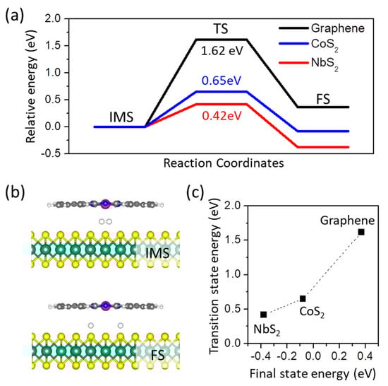 Finally, we replaced the Au(111) surface with a monolayer of a two-dimensional material. We tried different candidates, namely, graphene and transition metal dichalcogenides such as NbS2 and CoS2, which are metallic. Reaction pathways are shown in Figure 4a and the corresponding side views of the intermediate and final states in an MnPc/NbS2 system are shown in Figure 4b. In an MnPc/graphene system the reaction is endothermic, while for NbS2 and CoS2 the reaction is exothermic. A single linear relation between the final state energies and the transition state energies is shown in Figure 4c, indicating that all transition state energies follow final state behavior: the system which has a lower final state energy shows better catalytic activity in the H2 dissociation reaction. The linear relation can be understood according to the universality principle in heterogeneous catalysis, namely, the Brønsted-Evans-Polanyi (BEP) relation []. The H2 entry barrier to the MnPc/NbS2 interface is 0.78 eV, which is smaller than the calculated binding energy (3.2 eV). Hence, metallic transition metal dichalcogenides are good candidates for the quantum nutcracker because the reaction is mediated by the electronic properties of the surface.