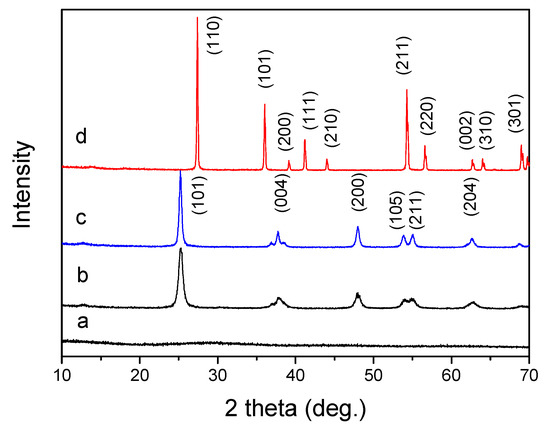 XRD patterns of titanium samples, (a) titanium precursor, (b) TiO2-350, (c) TiO2-550, (d) TiO2-800.