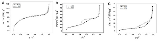 N2 adsorption-desorption curves of titanium samples, (a) titanium precursor, (b) TiO2-550, (c) TiO2-800.