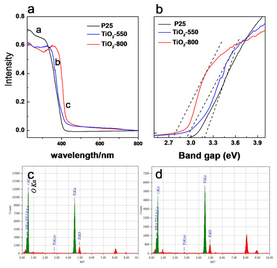 (a) UV-vis spectra of TiO2 samples, (b) calculated according to the formula αhν = A(hν − Eg)n/2, (c,d) EDS spectra for TiO2-550 and TiO2-800.