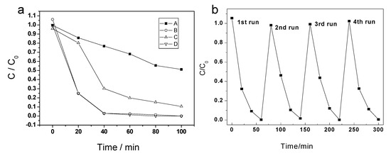 (a) Photocatalytic degradation of RB under UV-light irradiation, A—blank control, B—P25, C—TiO2-550, D—TiO2-800. (b) Recycling test for RB degradation over TiO2-800.