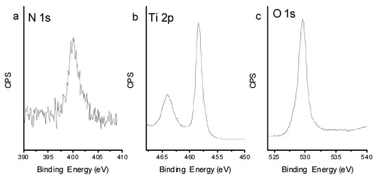 XPS spectra of TiO2-800, (a) N 1s spectrum, (b) Ti 2p spectrum, (c) O 1s spectrum.