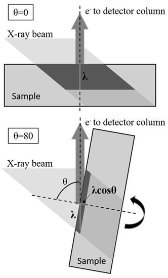 ARXPS set-up scheme. The angle between the X-ray beam and the detection column is constant. Polar angle is the angle between the sample normal and detector column and is selected by tilting the sample stage. An electron that can escape from the sample by traveling a distance λ in the detector column direction can come from the same depth λ as the maximum for θ = 0°. For different θ values, the same electron will escape from a reduced maximum depth equal to λcosθ. The region from which electrons can escape by travelling a distance λ to the detection column is dark shaded.