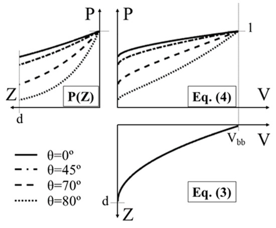Functions resume for the generation of a band bending contribution: P(Z) is the inelastic electron escape probability (see Equation (1)) for λ = 2.4 nm and θ = 0°, 45°, 70°, and 80°. Equation (3) is the potential curvature obtained from the Poisson’s equation solution based on the Schottky approximation for V0 = 0, band bending maximum potential Vbb, and band bending width d. Equation (4) is obtained by substitution of z in Equation (3) into P(z). It must be noticed that, in the XPS spectrum, a downward band bending is seen toward higher binding energy (B.E.).