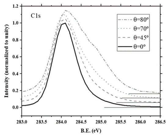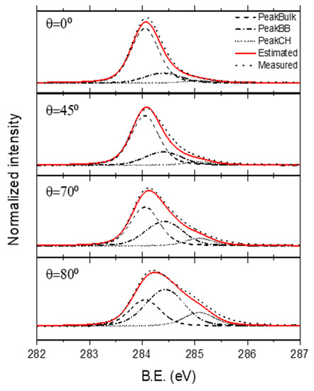 The measured (100) H-diamond ARXPS C 1s spectra for θ = 0°, 45°, 70°, and 80° are shown in Figure 3. By using λ, it is possible to calculate the escape probability P(z) curve for selected polar angles θ = 0°, 45°, 70°, and 80° (see Equation (1)) and, thus, the sensitivity depth can be estimated. Since P(z) follows an exponential decay with depth z, the sensitivity depth can be represented by the z value for P(z) < 99%, that is 11.05, 7.81, 3.78, and 1.91 nm for θ = 0°, 45°, 70°, and 80°, respectively. However, it must be noticed that most of the signal is due to quite lower z values. Thus, the z value for P(z) < 50% can be attributed to 1.66, 1.17, 0.56, and 0.28 nm for θ = 0°, 45°, 70° and 80°, respectively. The position of the diamond bulk contribution is expected to be at the maximum peak of the C 1s spectrum at θ = 0°, since in that case, most of the signal should come from the fixed bulk C 1s level. Thus, the diamond C 1s bulk contribution was found at 284.05 eV, which is very similar to previous results [28]. On the other hand, C 1s spectrum at θ = 0° appeared asymmetric with a tail toward a higher B.E. As θ increases, it is clear that this tail becomes a higher contribution with increasing intensity with respect to the bulk contribution. This indicates the surface nature of this second contribution. The position of the maximum C 1s peak moves toward a higher B.E. very slightly for increasing θ values. Very similar behavior has previously been observed by S. Kono et al. [18].