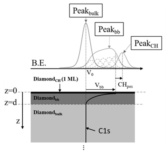 The X-ray photoelectron spectroscopy (XPS) technique has been widely employed for studying diamond chemical terminations [22,23,24,25,26,27], but the interpretation of the peaks are still controversial. The detection of the H-diamond surface downward band bending was supported by ARXPS experiments that, on the other hand, are rarely found in the literature. By varying the polar angle, ARXPS can be more surface sensitive than conventional XPS, allowing the study of the effects occurring along the sample depth axis in the outermost nanometers of the sample. Band bending is commonly characterized by a shift observation of a core-level maximum peak from the Fermi level. In the case of diamond, this core-level is the C 1s and the position of the Fermi level is obtained from a metallic energy reference (e.g., gold) or by C 1s calibration [28]. A depth profile of the positions of the maximum C 1s peak for different polar angles is used to characterize the surface band bending potential Vbb. This method is widely used in the literature, but can have strong limitations, for example, in the case of a very short band bending width, d. In such cases, most of the detected signal will be related to the bulk of the sample and a shift of the sample main core-level maximum peak can hardly be detected. Furthermore, the band bending width would remain unknown by this method.