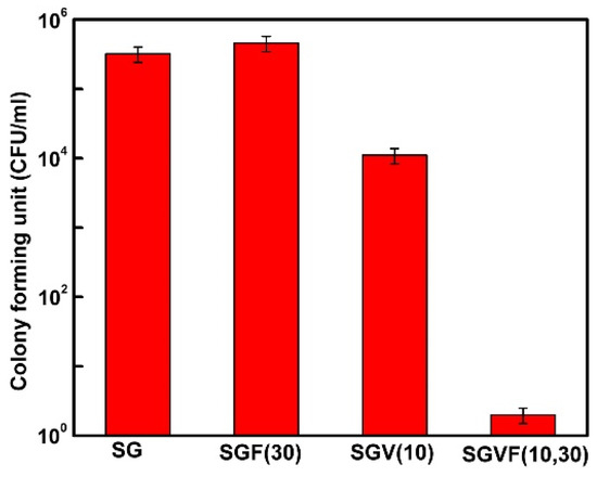 Quite importantly, farnesol can be also used as an additive that reduces the rate of bacterial biofilms’ growth on polymeric systems. In vitro experiments showed that FOH can act as an adjuvant with conventional antibiotics. For example, farnesol and lipopeptide from Bacillus subtilis AC7 (AC7BS) exhibited a synergistic effect on the inhibition of Candida albicans’ biofilms’ growth on catheters made of silicone elastomers [50]. C. albicans are responsible for dangerous infections caused by their biofilm formation, whereas FOH inhibits the filamentation regulating the yeast-to-mycelium conversion and thus influences the biofilm size [51]. The simultaneous application of both compounds exhibited a stronger activity than each molecule on their own. Their synergistic effect reduced C. albicans’ adhesion up to 74% at 1.5 h and the biofilm growth up to 93% at 24 h. Farnesol was also applied for the surface modification of orthopedic implants [52]. A limited blood flow and high porosity of bones increase the risk of bacterial infection in tissues surrounding implants. A high concentration of antibiotics that are required after orthopedic surgeries can produce irreversible organ damage. To prevent this situation, the simultaneous local delivery of an antibiotic (vancomycin) and an adjuvant (farnesol) was proposed to potentiate the therapeutic effect. Although the incorporation of antibiotic and hydrophobic FOH into a biocompatible and highly porous silica sol–gel was not a simple task, it did not influence the stability of the thin films on the surface of implants made of titanium alloy and anodized Kirshner wires, and neither did it affect the release of vancomycin. A complete inhibition of S. aureus was obtained for films composed of 30 wt % of farnesol and 10 wt % of vancomycin (around 106-fold reduction in growth), whereas the application of identical amounts of the pure compounds had no bactericidal effect (Figure 1).