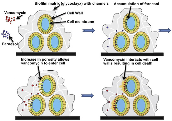 Farnesol adjuvant activity leading to the enhancement of vancomycin’s effectiveness [52]. Reprinted with permission from (Biomaterials). Copyright (2014) Elsevier.