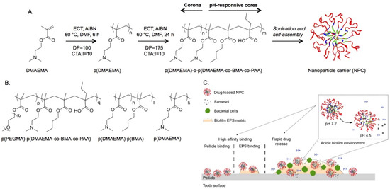 Synthesis and function of polymeric nanocarriers of farnesol and their antibiofilm activity [70]. (A) Depiction of the chemistry and self-assembly of diblock copolymers. (B) Structures of control polymers utilized to isolate the required physicochemical characteristics for binding to dental surfaces. (C) Proposed mode of action of pH-responsive nanoparticles for the prevention and/or treatment of biofilms. Reprinted with permission from (ACS Nano). Copyright (2015) American Chemical Society.