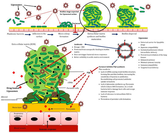 Proposed mechanism explaining the P. aeruginosa biofilm disruption by liposomes loaded with farnesol and ciprofloxacin [80]. Reprinted with permission from (Mol. Pharmaceutics). Copyright (2016) American Chemical Society. https://pubs.acs.org/doi/10.1021/acs.molpharmaceut.6b00360. Further permissions related to the material excerpted should be directed to the ACS.
