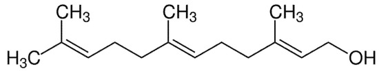 Chemical structure of farnesol (3,7,11-trimethyl-2,6,10-dodecatrien-1-ol).