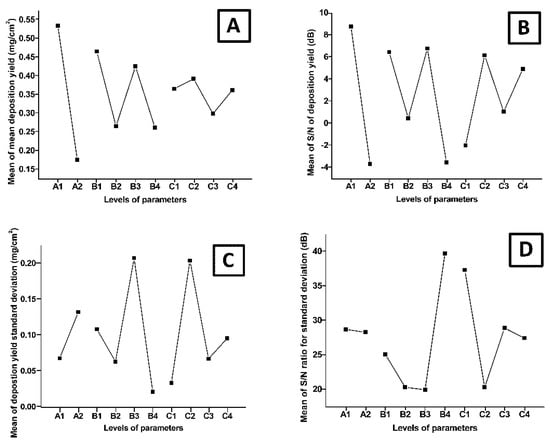 Effect of control factors on deposition yield. (A) Mean of mean deposition yield; (B) S/N ratio for deposition yield; (C) mean of standard deviation; (D) S/N ratio for standard deviation.